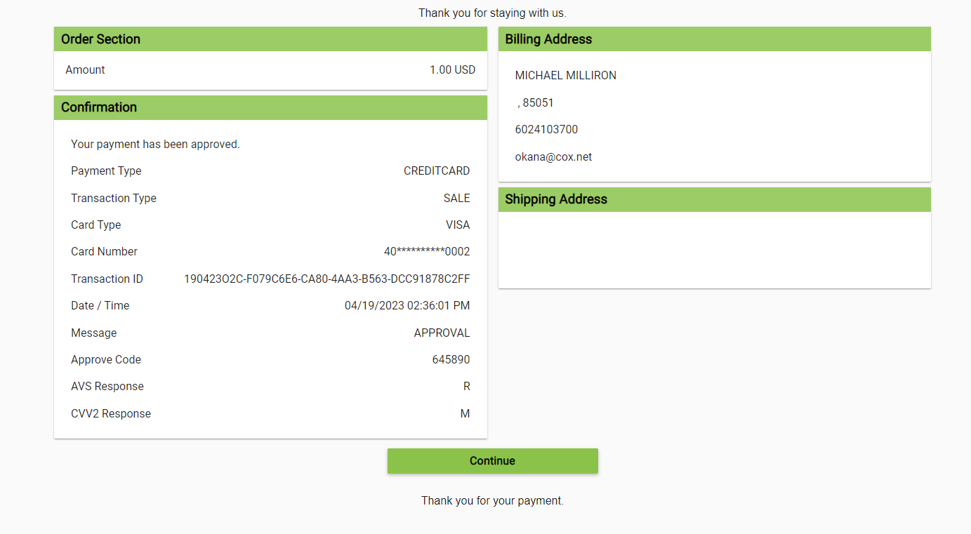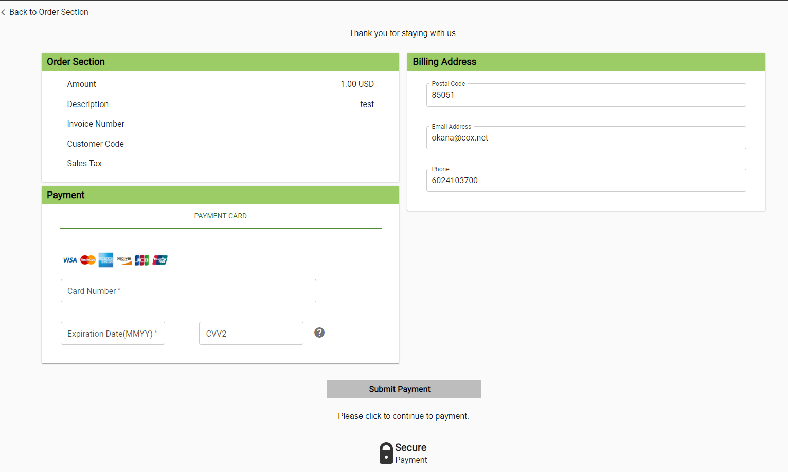 Having this page would allow "repeat" customers to submit payments on their own and allow our staff to charge on behalf oof the customer as long as we know how to get the CVV info .. or we do a 7 digit PIN that only the 4 of us knows.