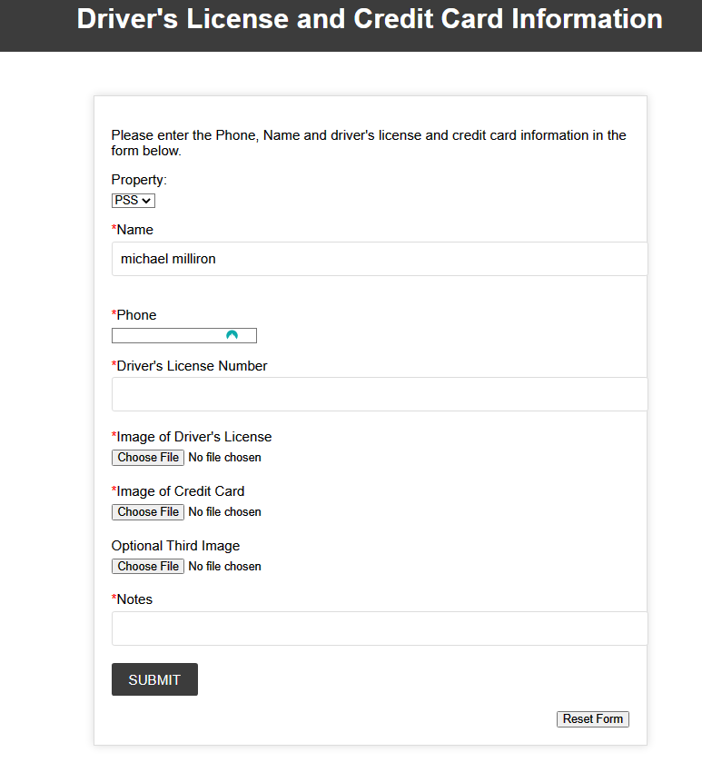 The customer will input CC info .. I would suggest we also have a place for the customer to load their DL - but that might be asking for too much. Instead, staff should always have a copy of the DL, and phone number before we even give them the link to submit CC info. The customer types in their phone #, last 4 digits of their DL number, and it displays image of their DL where they can then submit their CC info .. perhaps even with the verbiage "name on id must match with driver's license" .. that way, when they submit cc, their image will confirm we are not sending them to some bogus website. And I think folks are more inclined to type on a website as opposed to giving that info over phone and certainly better than text which is against PCI. That would certainly add legitimacy .. And as Angelie knows, to obtain that DL,we simply say "we need your DL to confirm name and age" - so normally not a big deal. And technically, there would be 2 name fields.. one from the DL and one for each credit card ..both names must show up on the payment confirmation email so that we can question if there is suspected fraud.
